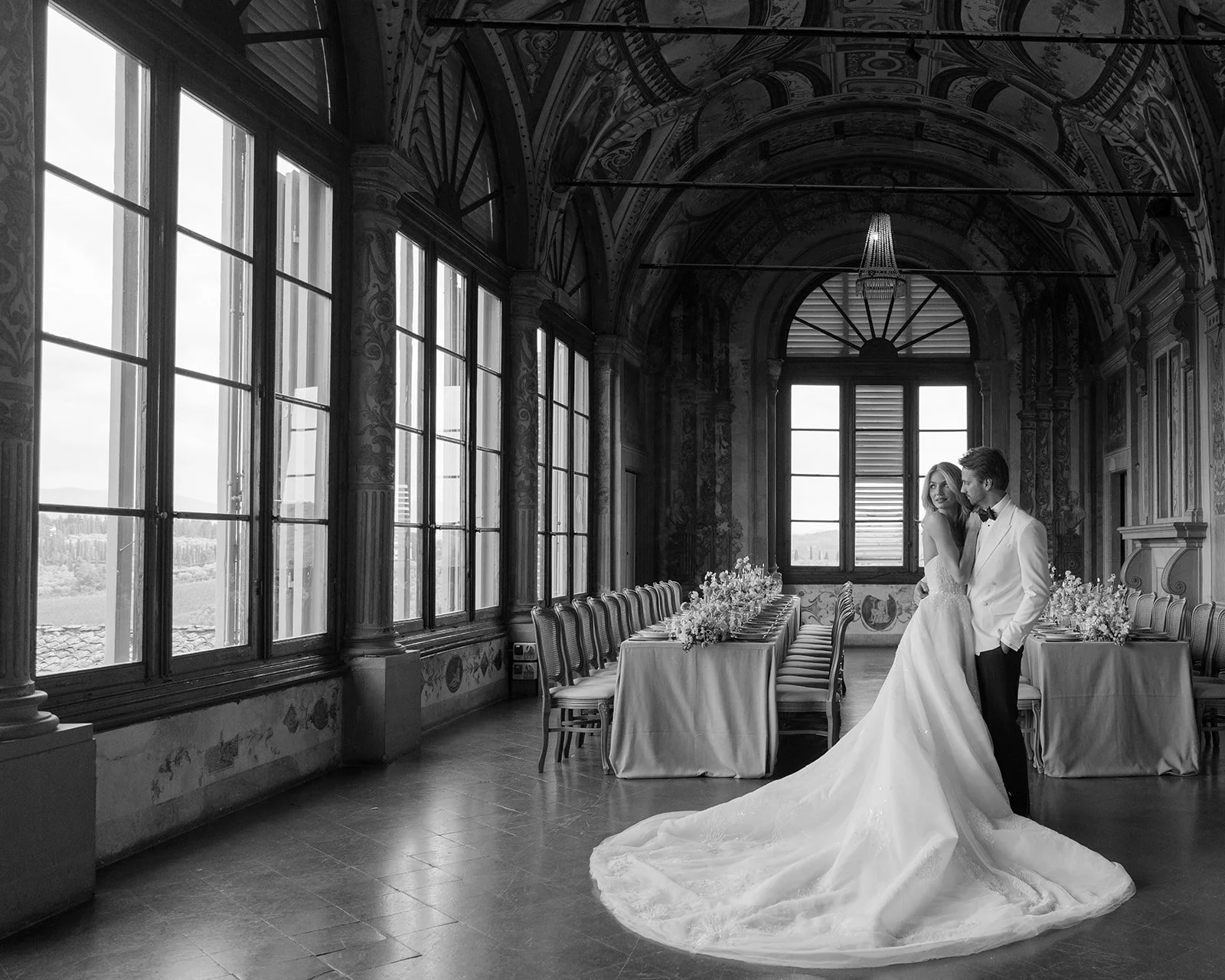 One of the aspects I loved most about shooting at Villa Corsini was the abundance of natural light. The large windows and open spaces allow sunlight to flood the interiors, creating a warm and inviting atmosphere. This natural illumination enhances the colors and textures in the photographs, adding a soft, ethereal quality to the images. During the golden hour, the light is particularly magical, casting a golden glow over the entire venue and creating a dreamy ambiance that is perfect for capturing intimate moments between the bride and groom.